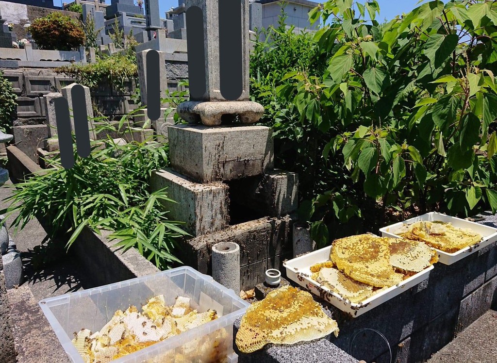 養蜂專家到場後,確認這些蜜蜂真的是日本原生種,於是合力打開墓碑旁的骨灰室,裡面竟然是比想像中還大、純白又漂亮的蜂巢,幾乎塞滿整個骨灰室。根據松崎智海PO出的照片,取出的蜂巢擺滿一大箱及兩大盤都綽綽有餘。