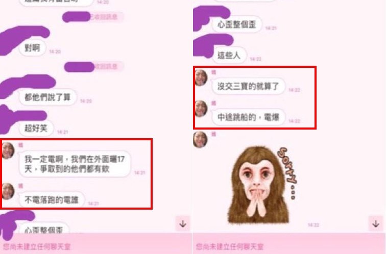 接著成員們在LINE群組中討論臉書的PO文內容,以及是否該去留言平衡一下爭議,這時,郭芷嫣半開玩笑地說出,「我一定電啊,我們在外面曬17天,爭取到的他們都有耶,不電落跑的電誰」、「沒交三寶的就算了,中途跳船的,電爆」;但也有成員緩頰說,「拿回三寶的我尊重,但不想跟他們講話」。