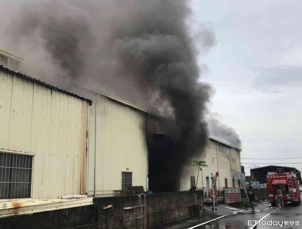 ▲台南市永康區正北五路一處紙箱工廠發生火警,消防人員全力搶救。(圖/記者林悅翻攝)