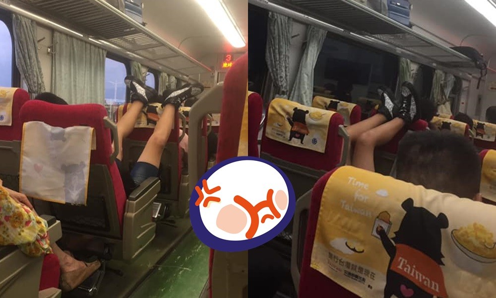 一名女網友日前搭乘台鐵,看到眼前一幕,忍不住火大拍下照片PO上網。只見在她左邊前2排位置上有一名乘客,對方不僅將椅子整個往後靠,還爽躺在座椅上,並將一雙腳抬高,把腳踝放在前面位置上方,重點是前方坐位有其他乘客。看到這樣的抬腳行為後,其他人相當傻眼,「好沒水準」、「我看了也衝動了。」