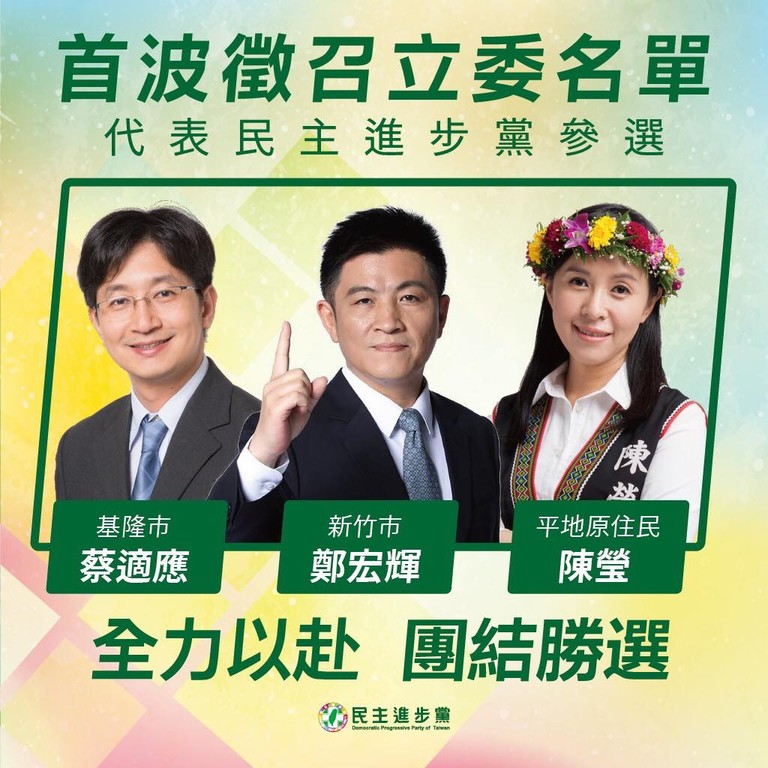 周江杰轉述,中執會中通過基隆市徵召蔡適應同志、新竹市徵召鄭宏輝同志代表民進黨參選第10屆區域立法委員,另徵召陳瑩同志代表本黨參選第10屆平地原住民立法委員。