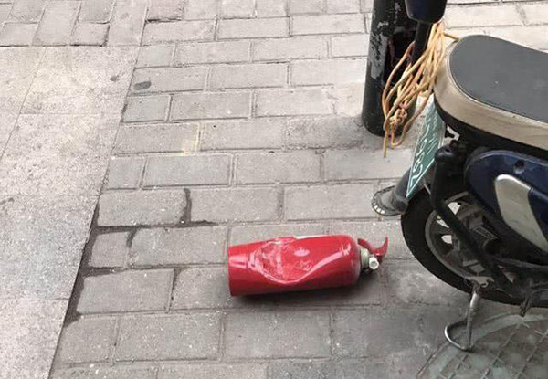 ▼掉落的滅火器已經變形。(圖/翻攝自《澎湃新聞》)
