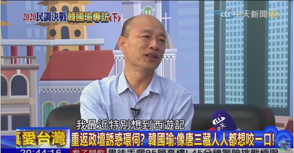 韓國瑜接受節目專訪時,聊到西遊記故事,他談到「為什麼唐三藏西天所有妖魔鬼怪都要綁架他、要煮他、吃他一口肉?因為他九世元陽,所以他一口肉一吃,可以多活3000年,我就特別想到這個」,「唐三藏西天取經的過程,他的各方面這種幻影、妖魔鬼怪想要綁他、吃他,然後逼跟他結婚等等的,他這種、他要經歷多少的困難,多少的痛苦,我也不曉得最近為什麼這樣」,一席話讓外界解讀為是吐露自身心聲。