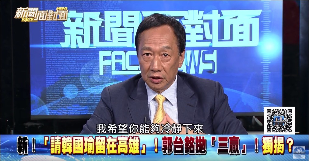郭台銘接受年代政論節目《新聞面對面》訪問時,透過鏡頭對韓國瑜喊話長達2分13秒,內容提到,兩人的出身都差不多,都是在國家命運風雨飄搖之際,韓能夠在1124(2018年九合一選舉)把高雄贏回來,讓國旗在南部站起來,是台灣歷史上無人可及的功勞,但現在面臨2020年的總統大選,「我想你掌握了國家未來20年的命運,你自己的決定,我希望你能夠冷靜下來,好好想一想。」
