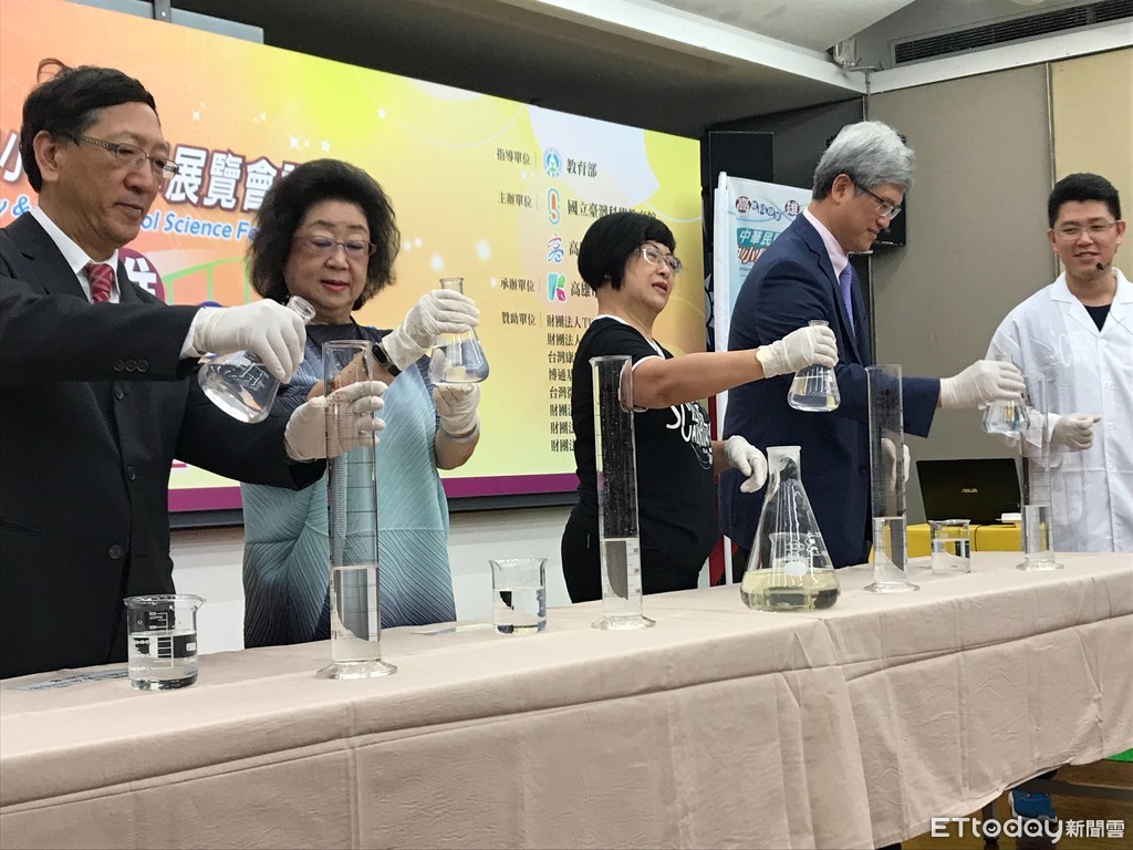 ▲第59屆全國中小學科展展前記者會於教育部舉行,科教館自然老師邀教育部次長范巽綠演示化學實驗。(圖/記者崔至雲攝)