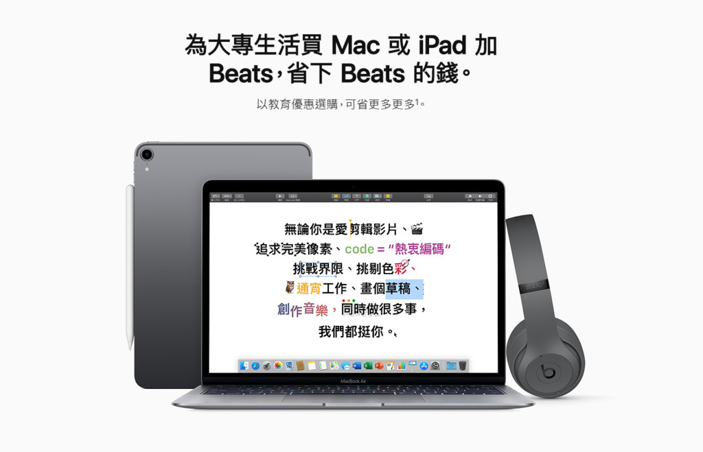蘋果近期推出「開學促銷活動」,只要購買指定的 MacBook或 iMac ,就可免費獲得 Beats Studio 3 Wireless 頭戴式耳機,這項活動適用於高等教育學生、學生家長、教職員工,以及自學方案教師等透過 Apple 教育商店購買。蘋果9日更新的 MacBook Air以及搭載Touch Bar入門級 13 吋 MacBook Pro也都在這次的開學促銷活動名單中。