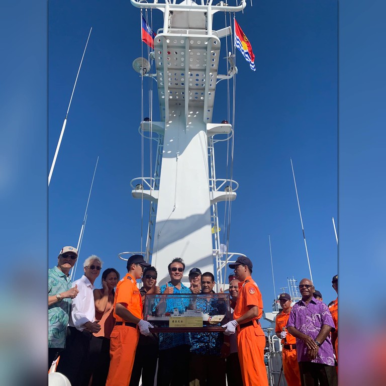 ▲蘇嘉全赴吉里巴斯登上「巡護九號」。(圖/蘇嘉全辦公室提供)