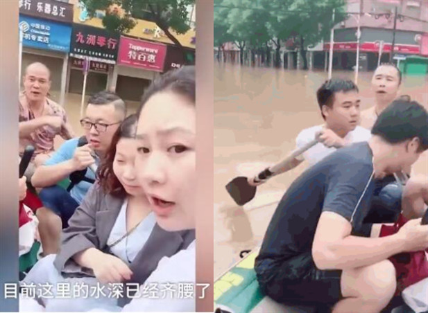 因當地電視台地處臨河道路,也變成了一片「汪洋」。為了確保來自一線的新聞及時播發,這群媒體人選擇了結伴划船上班。當地融媒體中心的主播周文琪甚至當場播報新聞,「這裡的水深已經齊腰了,一路上隨處可見被泡在水裡的汽車。」她話音未落,舟艇上就傳來另一位女生的聲音,「啊等一下,不要突然站起來,不然會失去平衡,慢慢慢慢慢慢……。」