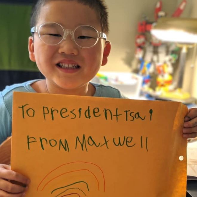 總統蔡英文於美東時間13日上午(台灣時間13日晚間),在紐約中央公園與台灣留學生一同健走,隨行的1位男孩拿出自己親手寫的信封交給蔡英文,信件內容提到,「親愛的蔡總統,謝謝妳保護台灣,還有我在彰化和三峽的阿嬤和阿公,妳是我的超級英雄。」還附贈了蔡英文牽著貓的畫像。