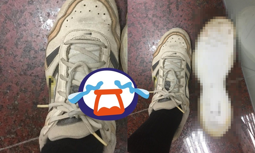 不過照片中,原PO拍下的是左腳,但畫面上卻還有2個左腳的形狀,仔細一看才發現,原來右邊的根本不是鞋子,而是鞋子的鞋底。因為男網友把這雙鞋放了10年,鞋子的膠應該早就變質不黏了,所以一穿出門馬上解體。