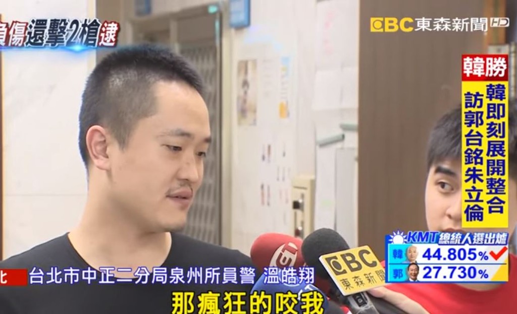 台北市中正二分局泉州派出所警員溫皓翔、李陏恩14日晚間11點多巡邏時,發現一名沈姓詐欺通緝犯,立即展開追捕;期間對方竟然狠咬溫員,導致他的虎口當場血肉模糊。警方表示,由於沈男一直持刀亂揮,為自保朝他腿部連開2槍。