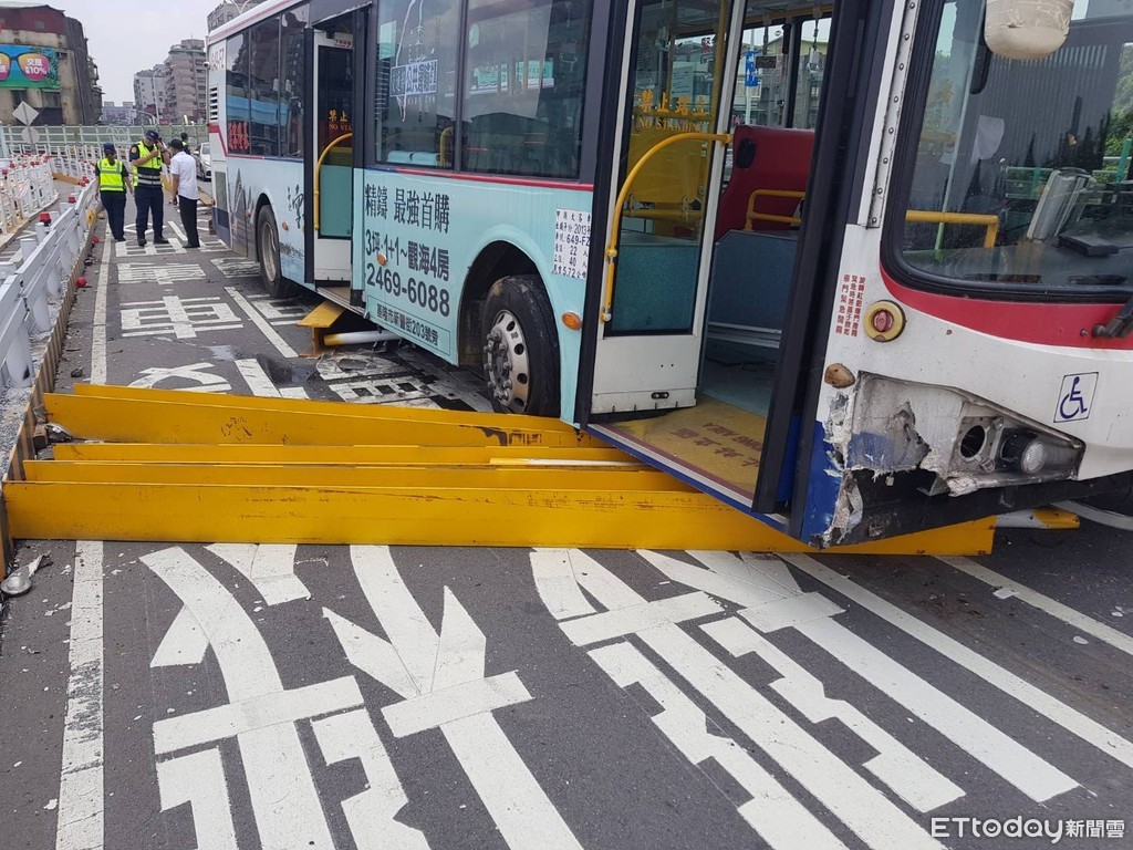 ▲基隆客運司機在福和橋上自撞施工護欄,幸好無人傷亡 。(圖/記者陳以昇翻攝,下同)