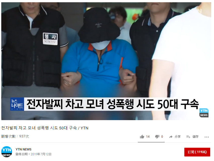 南韓一名51歲的申姓男子10日時,闖入光州一處住宅中,試圖性侵在房裡沉睡的女子未果,竟把目標放向同在一間房裡的8歲小女孩;雖然最後警察及時趕來,男子也因性侵未遂遭逮捕,但該名男子似乎沒有意識到自己的行為有任何不妥,竟然在被捕時大放厥詞的說:「我是性侵未遂,就算進了矯正所也很快就會被放出來,如果出來了,我就要把報警的人殺掉。」