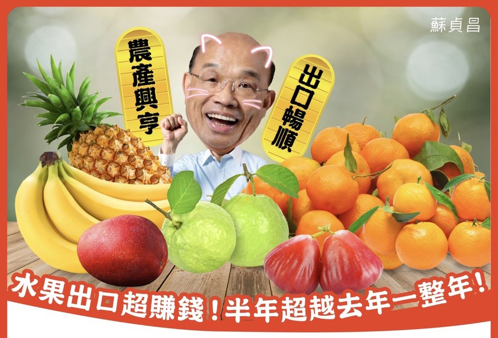 行政院長蘇貞昌13日透過LINE與國人分享好消息,「政府與農民一起打拚,今年上半年的農產品外銷創歷史新高」。被網友稱讚超有梗的蘇貞昌小編這次「亂入」臉書粉絲專頁加藤軍台灣粉絲團2.0,搞笑宣傳外銷政績,「台灣農漁產品外銷創新高,所以我現在是++貞昌」。