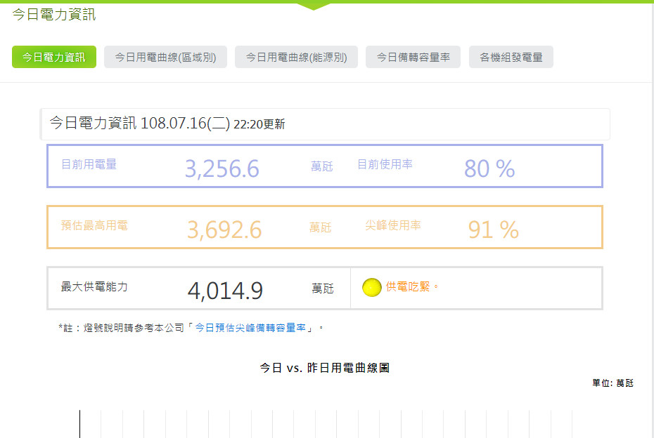 ▲2019年7月16日全台用電史上第二高,燈號為黃燈吃緊狀態。(圖/翻攝自台灣電力公司網站)