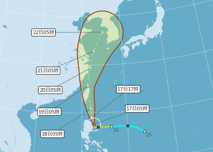 氣象局已於16日深夜11時半發布海上颱風警報,官欣平指出,如果颱風路徑變化不大,可能在今近中午發布陸上警報。根據氣象局最新路徑潛勢預測圖,估颱風從花蓮登陸、新北出海;且根據各國最新預測,颱風都會在東半部登陸。對此,他說,颱風受呂宋島地形影響,颱風中心有「跳躍」情形,導致預報不確定性增加,登陸變動性很大,每一報都還再調整,「但不管路徑怎麼走,直接影響台灣。」