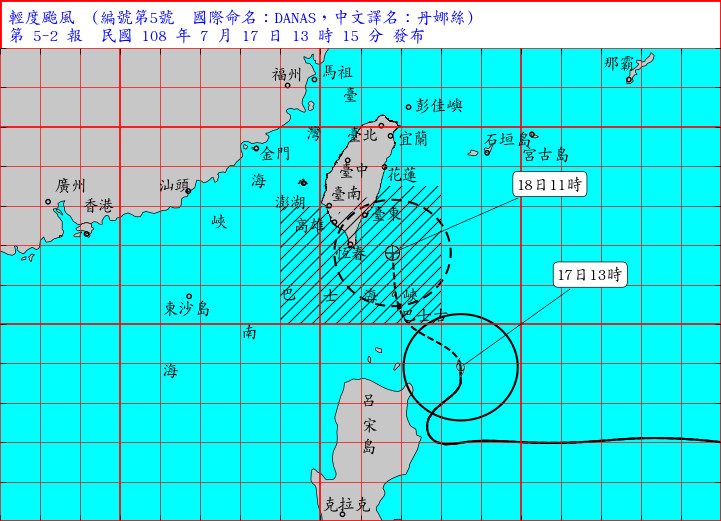 隨著輕颱丹娜絲持續逼近台灣,氣象局14時30分擴大陸警範圍,除台東、屏東及恆春半島外,也將花蓮納入警戒區。目前丹娜絲以每小時17公里速度,向西北進行,預測18日14時的中心位置在鵝鑾鼻的東北東方約150公里海面上。其暴風圈正逐漸進入巴士海峽,對台東、花蓮、恆春半島及屏東地區將構成威脅。