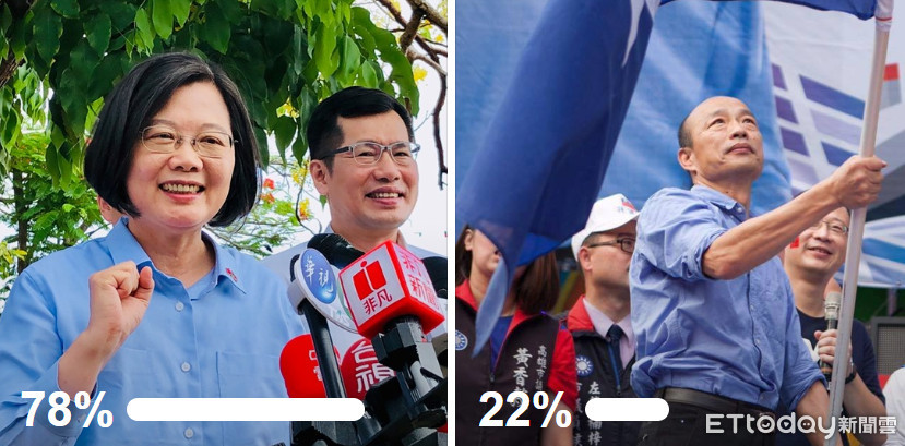 高雄市長韓國瑜在國民黨總統初選中勝出,確定將代表國民黨爭取2020總統寶座,挑戰總統蔡英文的連任之路。針對2020大選藍綠2位,臉書粉專《ETtoday筋斗雲》16日早上10點進行網友投票,統計結果於17日中午出爐。蔡英文以78%的支持度獲得壓倒性勝利,而韓國瑜僅得22%。