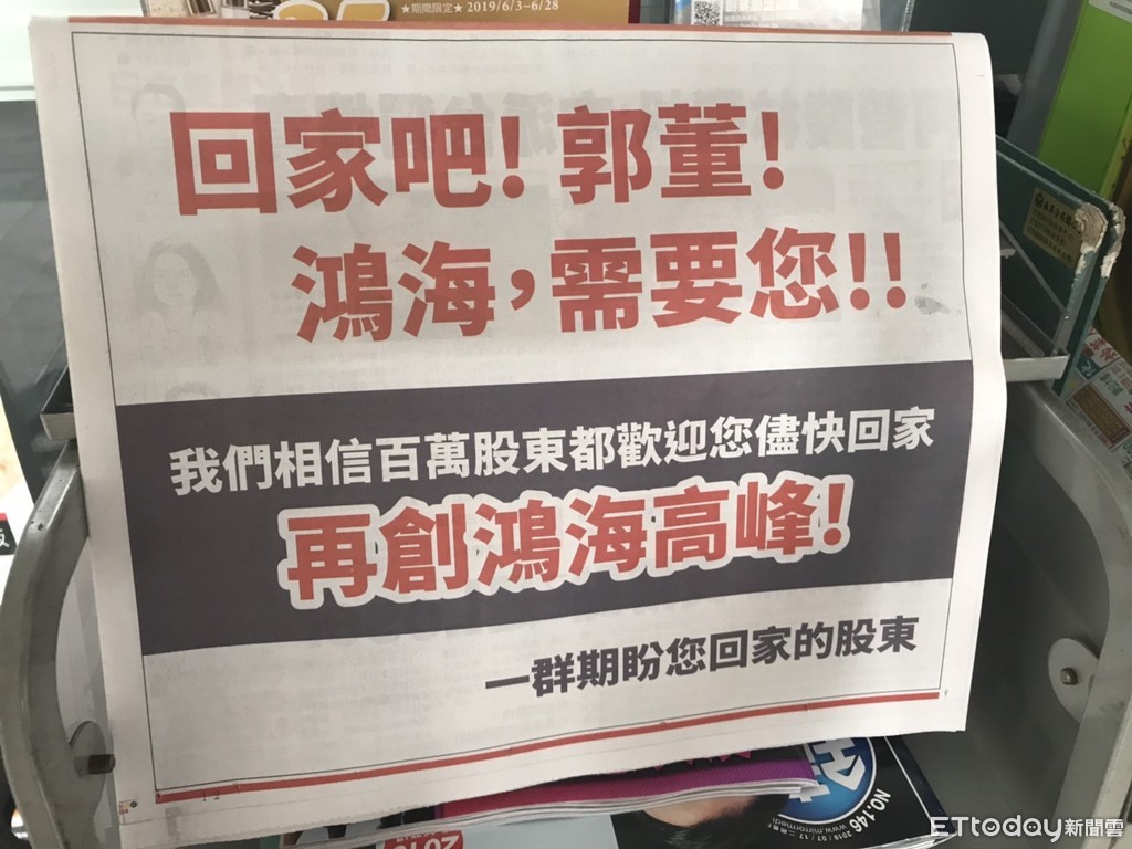 《聯合晚報》17日頭版下的半版廣告顯示,有一群自稱是期盼郭台銘回家的股東稱,「回家吧!郭董!鴻海,需要您!!我們相信百萬股東都歡迎您盡快回家,再創鴻海高峰!」