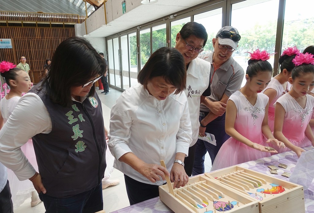 市長黃敏惠市長等人17日上午記者會為2019兒童藝術嘉年華活動揭開序幕,體驗闖關用的古早童玩,黃敏惠展現童心,重溫方塊酥沙包、彈珠檯、響鈴陀螺等兒時樂趣,直呼好玩。