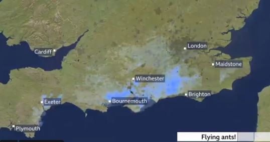 英國氣象衛星17日早上偵測到南邊海岸有一股雜波,研判附近的漢普郡(Hampshire)、 西薩塞克斯郡(West Sussex)以及多塞特郡(Dorset)將可能降雨。不過經過氣象局人員再次確認,卻發現原來衛星錯將「集體飛行的螞蟻群」辨別成雲雨,一切根本只是誤會一場。