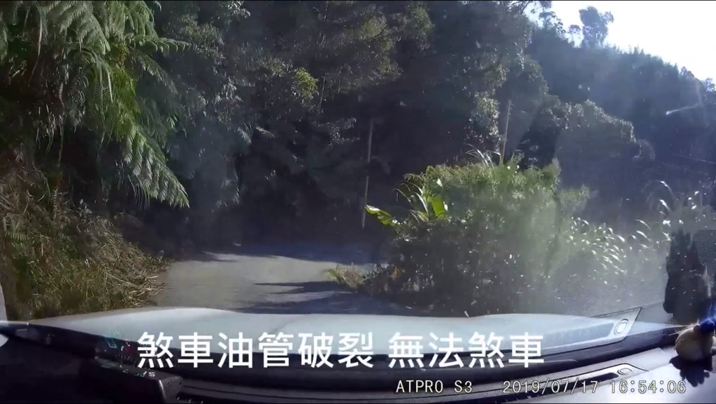 原PO在臉書社團《爆廢公社》貼出一段影片寫道,「昨天在山上遇到下坡煞車油管爆裂事件,反應時間真的沒有幾秒,好險路況跟車輛操作我很熟,順利躲過一劫」,而因為該區拖吊車上不去,原PO只好硬著頭皮緊抓手剎車,一路衝下山。