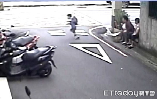 ▲路口監視器畫面顯示,男童家人還在旁邊和鄰居聊天,自己就跑到馬路上,被迎面而來的轎車撞上。(圖/記者黃孟珍翻攝)
