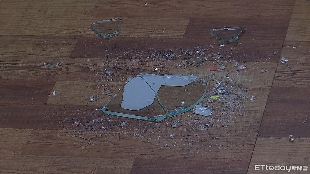 ▲被砸破的玻璃噴飛。(圖/記者洪正達翻攝)