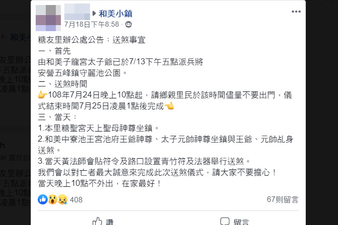 里長公告在彰化和美、伸港等社團流傳,提醒附近住戶24日深夜10時以後避免外出,儀式將於25日凌晨1時後完成結束,不過目前仍未有確切路線圖,引發當地人緊張。有網友聲稱,日前曾聽說有人在公園廁所後的樹上上吊輕生,雖然公園日夜都有很多人,但很少有人經過該處。