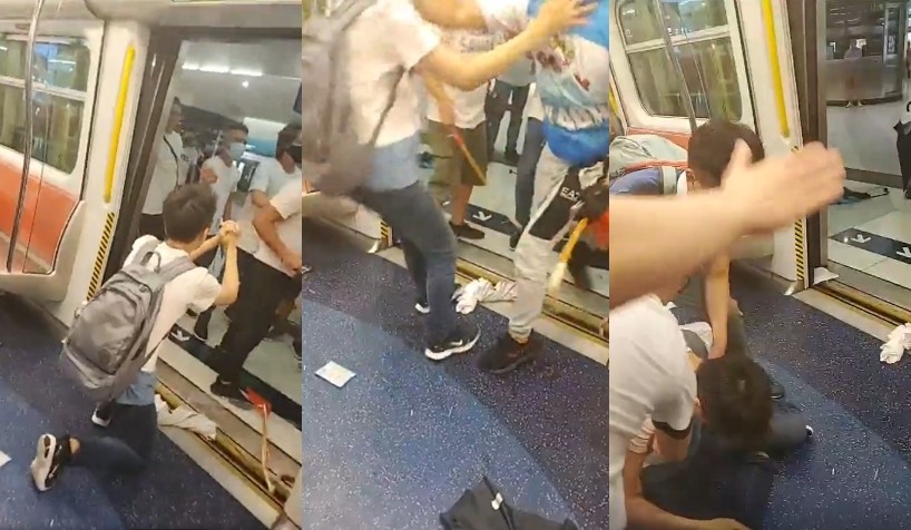現場背景有女生聲音大喊「不要打啦」、也有許多婦孺無助哭喊;之後有一名青年在車廂門口跪下求饒,拜託白衣人士們不要再打了,但才站起來沒多久,撿起打人群眾的東西交還後,就被一名男子「啪」一聲大大打臉,隨後往後倒在地上。