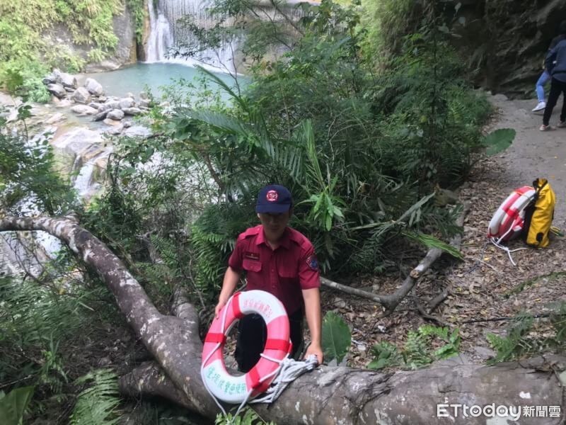 ▲▼花蓮縣消防局吉安分隊為保障遊客安全,派員至翡翠谷架設固定點並裝上救生圈。(圖/吉安分隊提供,下同)