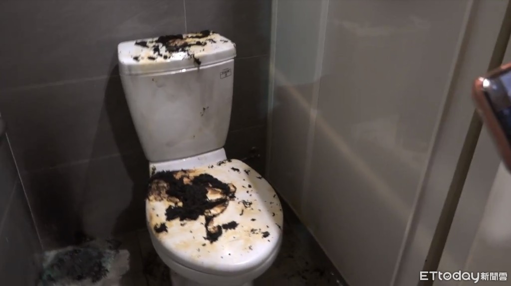 ▼廁所門板燒熔變形,天花板也被燻得一片焦黑。(圖/記者洪正達翻攝)