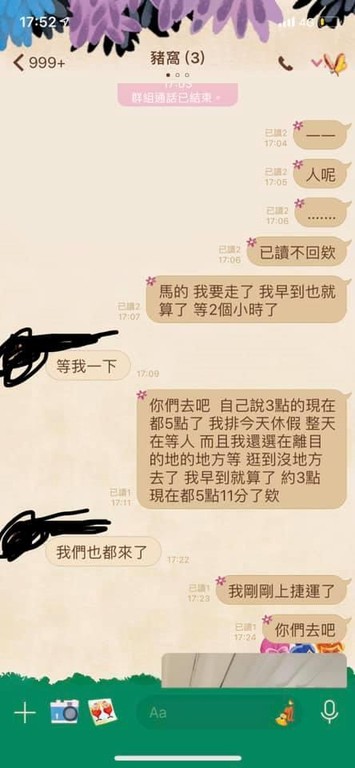 原PO接著說,又過了1個小時,5點鐘仍不見朋友蹤影,只看到對方一直傳LINE說到誠品了,接著就已讀不回,只好在捷運出口等她們,20多分鐘過了一樣沒看到人,和她們說「我要走了」,對方竟然還有臉回「等我一下,我們也都來了」,讓她爆氣的喊,「真的火都上來了,我知道今天雨突然下很大,但我等2個半小時了。」
