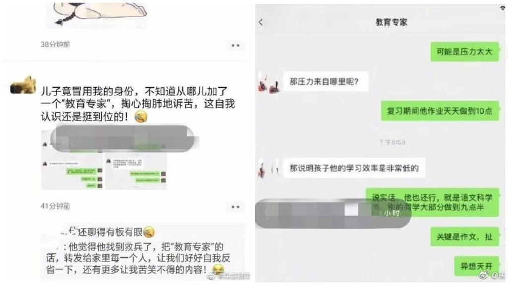 隨後俊俊在網路搜尋了「家庭教育問題」的關鍵字,找到一位教育專家並互加微信,一開始還擔心對方發現他是小孩,便假扮成「媽媽」的語氣,細數自己所遭遇的教育衝突,雙方一聊就聊了3小時,欲罷不能。從對話截圖可見,俊俊描述了自己做作業時遇到的困難,也指出爸爸太嚴格的問題,對此專家都詳細給予解答,還教育「媽媽」應該要多和孩子溝通、尊重孩子的個性發展。