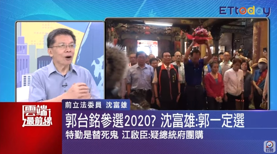 高雄市長韓國瑜在國民黨總統初選中勝出,代表國民黨角逐2020總統寶座,但鴻海創辦人郭台銘始終未把話說死。對此,前民進黨立委沈富雄23日在《雲端最前線》節目中篤定表示,郭台銘一定選,勝選機率過半。