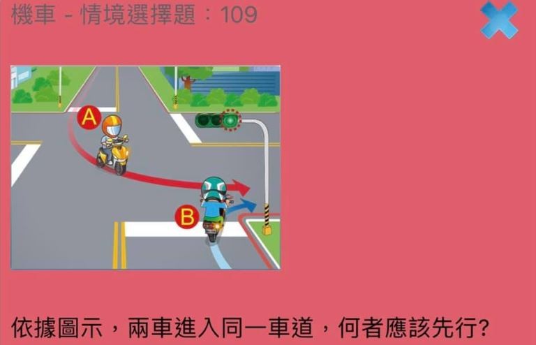 一名女網友在臉書社團「~~我愛鹿港小鎮~~」分享考題,「依據圖示,兩車進入同一車道,何者應該先行?(1)B車先行(2)A車先行(3)搶先者即可先行。」她認為,應該是右轉車先於左轉車,但正確解答卻是左轉車先於右轉車,讓她超不解,拜託網友幫忙解答。