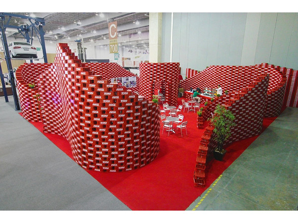 展覽官方提供場地,可口可樂提供五千多個飲料箱搭建,在這個咖啡廳裡營業不用花費任何一分裝潢費用,更棒的是拆卸後沒有任何廢棄物產生。