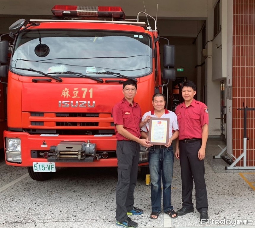 ▲台南市消防局第二救災救護大隊麻豆消防分隊隊員蔡佳宏及隊員姜志忠,成功搶救已無呼吸及心跳的楊姓工人,楊姓工人康復後特向消防人員感謝救命之恩。(圖/記者林悅翻攝)