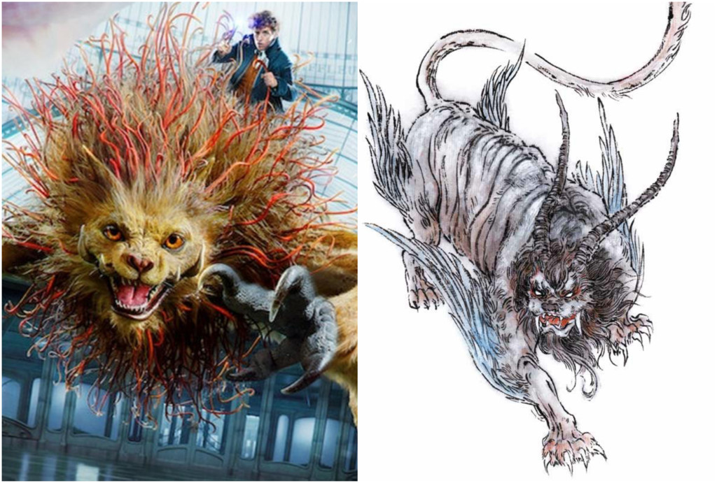 ▲電影《怪獸與葛林戴華德的罪行》裡出現的「騶吾」出自於《山海經》,在畫師杉澤的作品《觀山海》中重現。(左圖/《怪獸與葛林戴華德的罪行》劇照;右圖/聯經出版提供)