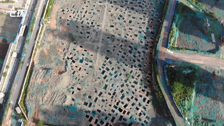 從《澎湃新聞》公佈的空拍畫面中可以看到,該建地坐落在都市當中,周圍還有許多其他的大樓和工地,建地中黃色的土地上有大量的方形墓坑,大小不一,分佈上似乎也沒有明顯的規律,一旁的鐵門上則掛著「考古重地,閒人免進」的牌子。