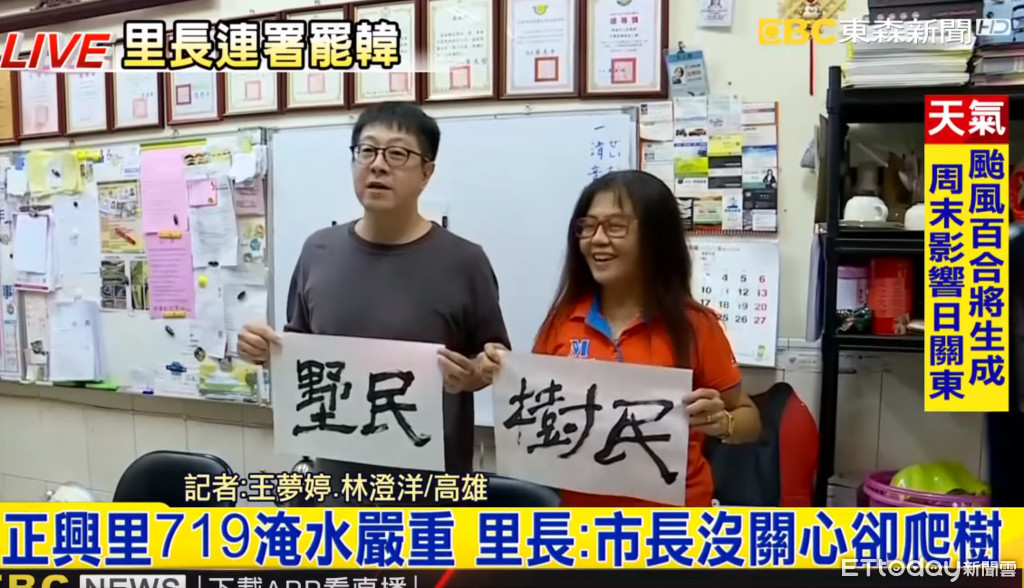 高雄三民區正興里里長沈秀玲日前開記者會,批評這次淹水原因是因為十全滯洪池的工程延宕造成,她拿出「樹民總統,緣木求瑜」的字牌調侃韓國瑜,並在里內發起罷韓連署活動,宣稱目前已經拿到2000多份罷免書。