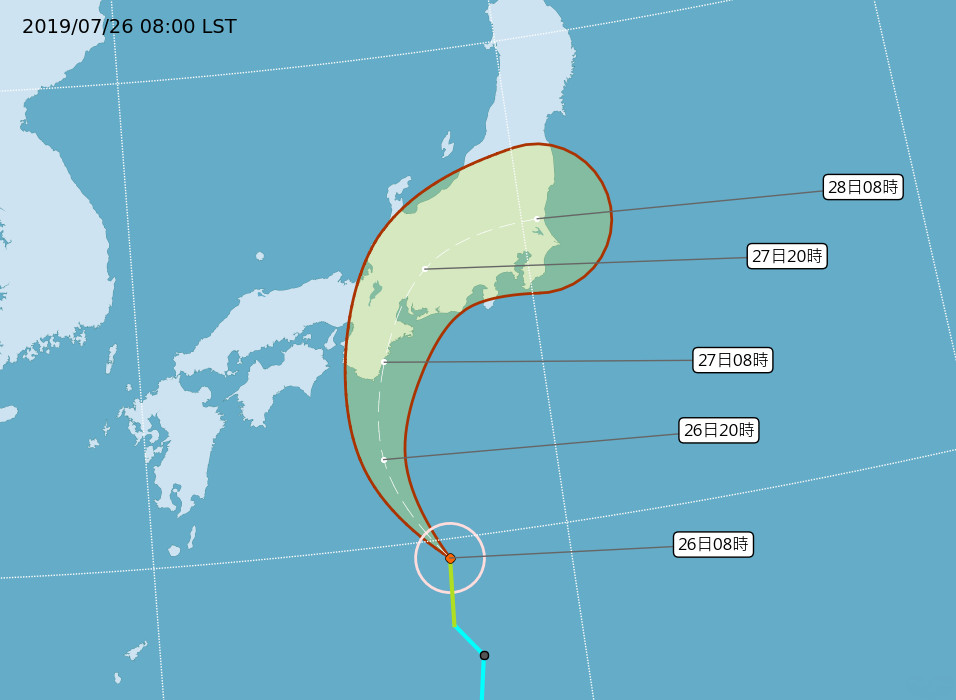氣象局26日上午8點發佈訊息,將原位於日本南方海面的熱帶性低氣壓,確定生成為今年第6號颱風百合(國際命名:Nari),目前颱風中心位置在北緯29度50分、東經137度05分位置,以時速20公里朝北前進。中心最大瞬間風速20米。