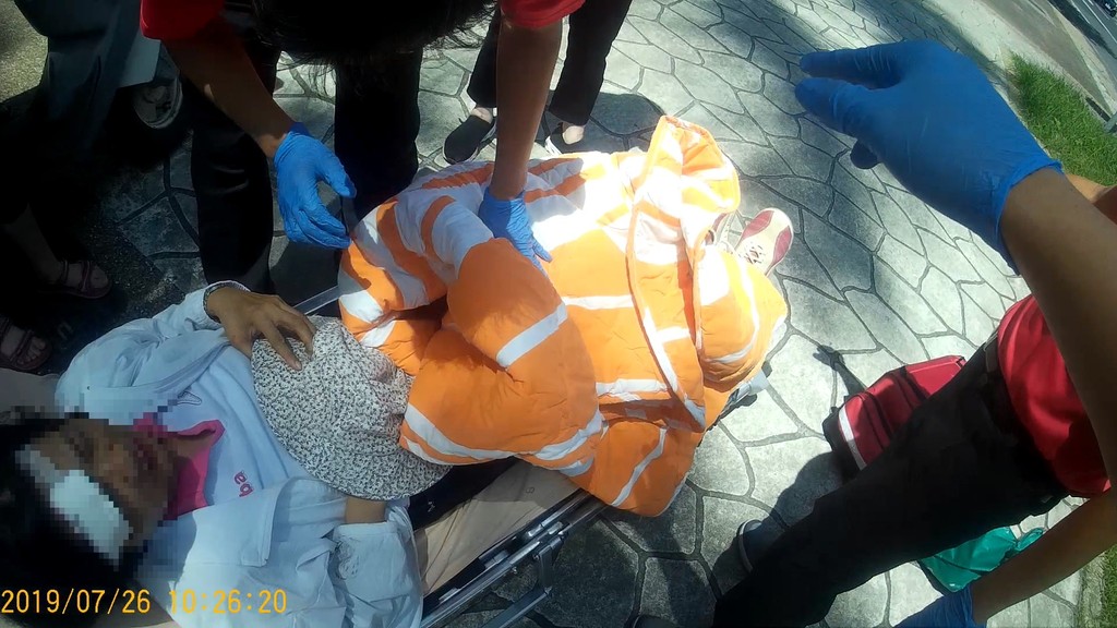 救護員到場時,先為蕭女評估生命徵象,發現傷者右邊額頭有一處擦傷、意識清楚,但有感覺頭暈的情形,救護人員給予急救處置後將傷患送往聖馬爾定醫院檢查。