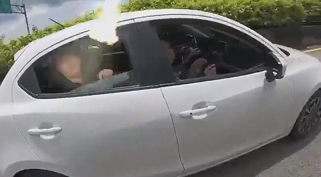 小客車突然搖下車窗,副駕駛座女子亮出一把手槍,右後乘客座的男子拿出一把衝鋒槍伸出窗外,朝天連開數槍,嚇得騎士馬上放慢速度,不敢再追上前。