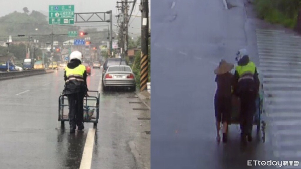 新北市三峽警分局橫溪派出所警員簡成堉22日擔服下午巡邏勤務時,巡經三峽區介壽路二段沿線,發現一名年約80歲阿嬤,被突如其來的午後雷陣雨下,年邁阿嬤駝背,推著堆疊大量回收物的車子,簡員眼看阿嬤要推車過一個路口,推車的速度緩慢,又適逢傾盆大雨,擔心其他車輛,因視線不清,阿嬤有危險之虞,立即下車協助阿嬤,將推車安全穿越路口。