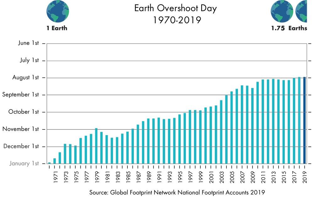 加州奧克蘭的(Oakland)的環保團體發佈聲明表示,人類對大自然的需求超過地球生態系統可以再生的時間,意味著人類目前使用地球資源的速度,比地球生態系統可以再生的速度快1.75倍,相當於使用1.75顆地球。