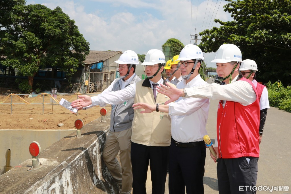 ▲行政院副院長陳其邁 偕同台南市長黃偉哲,至台南善化區視察「善化區茄拔排水護岸第二期及分洪治理工程,並取相關簡報。(圖/記者林悅翻攝,下同)