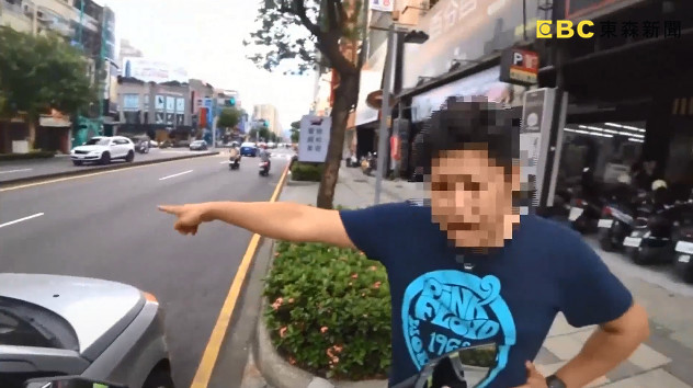 ▲男駕駛手指馬路,插腰教訓騎士「這邊是快車道捏!」(圖/東森新聞)