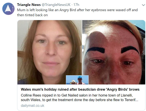 英國威爾斯37歲女子芮絲(Colline Rees)接受眉蠟美容,沒想到卻被畫成「憤怒鳥」,當場崩潰大哭。她表示,隔一天要到西班牙特內費里島(Tenerife)旅遊,如此一來完全沒了興致,甚至不敢上鏡頭,花費3000英鎊(約為新台幣11.4萬)的假期直接泡湯。