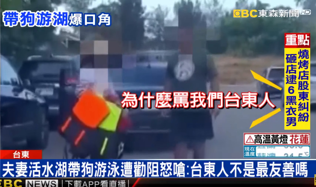 勸說的阿伯聽到後立刻爆氣,「為甚麼罵我們台東人,那個湖那麼乾淨,雖然狗也是小孩,但是規定寫得清清楚楚」。救生員表示,民眾帶狗下去的確會影響衛生,況且當下的確有吹哨警告好幾次。